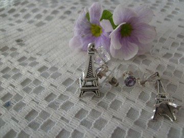 Aretes en plata quemada, tipo torre Eiffel, combinado con cristal y pasador con strass